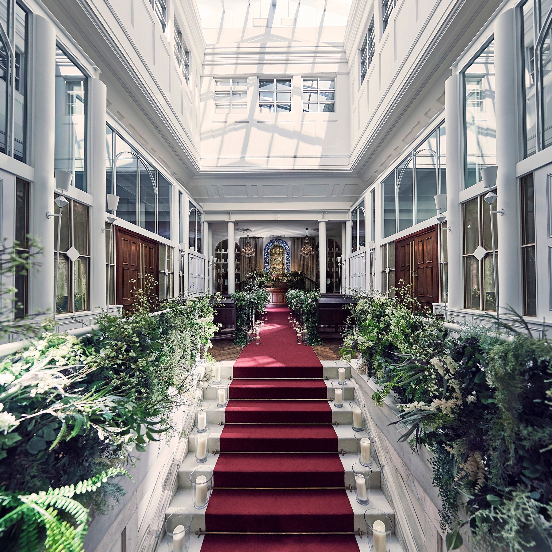 大階段に深紅の絨毯が引かれたバージンロード。「一段一段自分の道を進む」という意味が込められた大階段を上ると、その先でゲストが花嫁を出迎えてくれます。もともと大広間として使われていた吹き抜けの空間をそのまま残した『音の教会』は、高さ14mの天井に配された天窓からの光が、イギリスで100年間も使われていた伝統あるステンドグラスやバージンロードを歩く花嫁姿を照らし、ロマンチックな世界へと誘ってくれます。そして『ラ・バンク・ド・ロア』最大の特徴は、新郎新婦オリジナルのアンティークオルゴールを使った生演奏のセレモニー。祝福の音楽に満ちあふれた唯一無二のセレモニーが実現します。