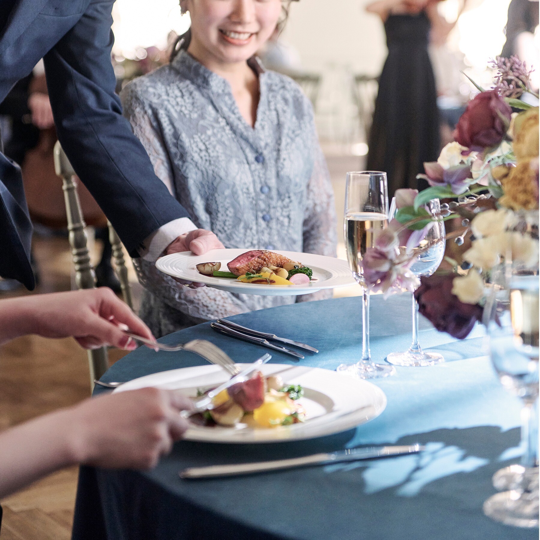 打ち合わせから当日まで、ふたりの傍でしっかりサポートしてくれる担当プランナーは、ふたりのイメージを引き出してくれると好評。その他にも、サービススタッフが『アペティスタイル』の料理を取り分けてくれたり、フローリストがふたりらしい空間を装花で彩ってくれます。大切な一日をスタッフ総出で一緒に作り上げてくれるので、安心して当日を迎えることができます。