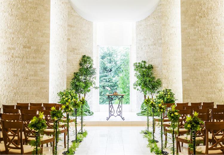 セレモニーの舞台となるのは、白を基調とした清楚なチャペル。祭壇奥には大きな窓が配され、鮮やかな緑とやわらかな自然光がふたりを包み込みます。1階席は着席スタイル、2階席には立見席が設けられています。