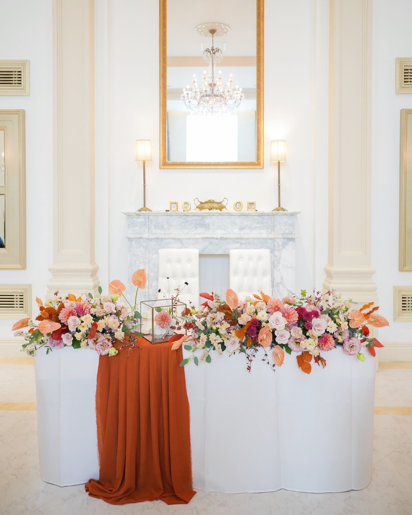 高砂装花⸜🌷︎⸝ tgでは、装花パターンが決まっていて 基本はそのパターンに沿って飾りつけをします。 オーダーメイドプランもあります✨ よくあるお花で課金まつり!!はなく、 定額の範囲内で飾りつけができます。 ※会場やコーディネーターで変わることがあるかもしれません。 よくばり夫婦の私たちは、 この色味がいいけど、盛り方はこっちがいいっていう モヤモヤした展開に💭 後ろはあえて装飾を入れませんでした。 私たち高身長がゆえ座高が高いので、ゲストが後ろにたったら全然見えないな、他に課金しよう!となりました。 テーブルラウンドをせず、高砂での写真撮影が中心と決めてたので、高砂装花に1番ボリュームを持ってきたかった🥺 ご協力もあって写真も映えてほんとによかった💗