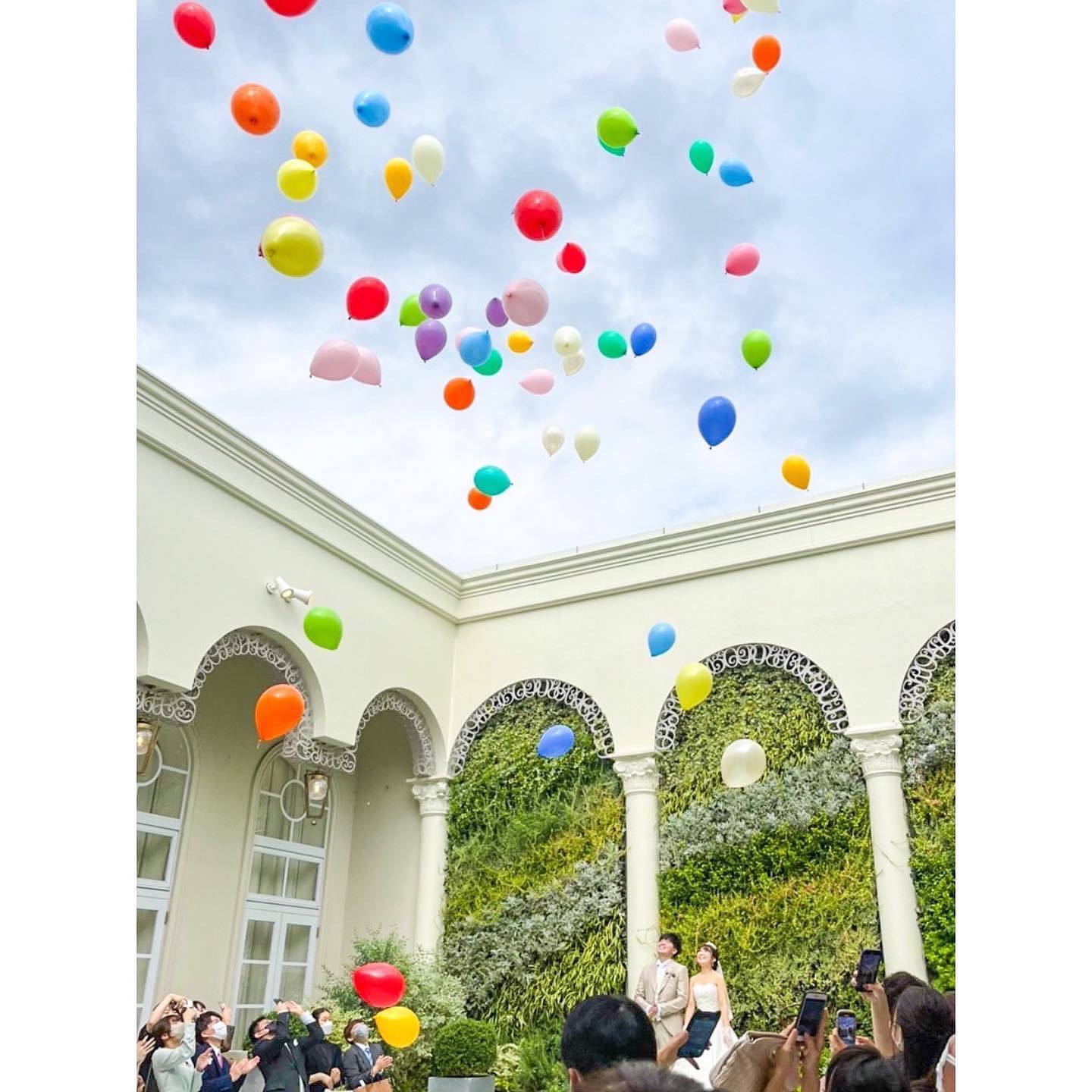 𓉞 ドロップ&フライ 新郎唯一の希望のドロップ&フライ 🎈 この時までお天気もってくれました 過去に参列した結婚式で私もやったことなかったので 初めての経験でドキドキワクワクでした🤎 パステルカラーやビビットカラー等 風船の色を選べましたが 私たちはいろんな色を混ぜてもらいました🎈 新郎新婦だけゴールドシルバー 𓂃 𓈒𓏸 飛んでいく風船たち綺麗だったなあ 😌🤍 是非とも誰かの結婚式にてまたしたい!!(笑)