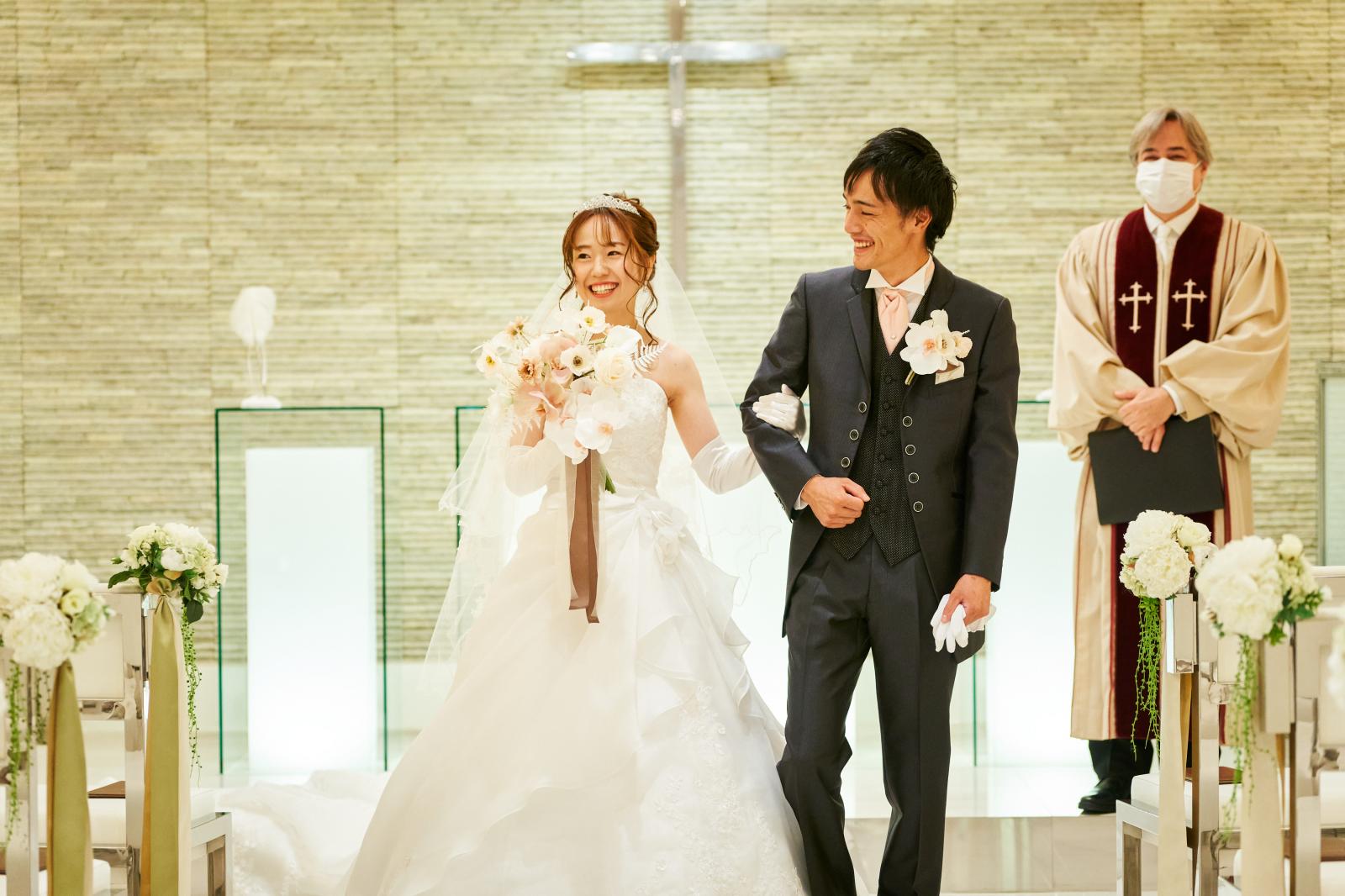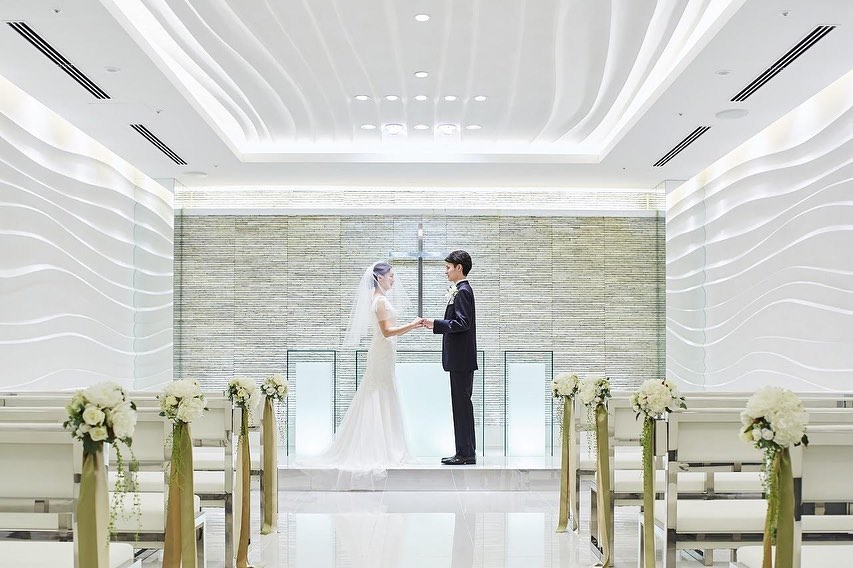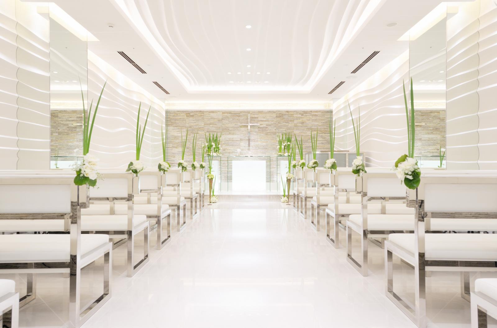 清らかな水の流れを思わせる壁面のやわらかな曲線と大理石のバージンロードは水面のように輝く上質空間。
