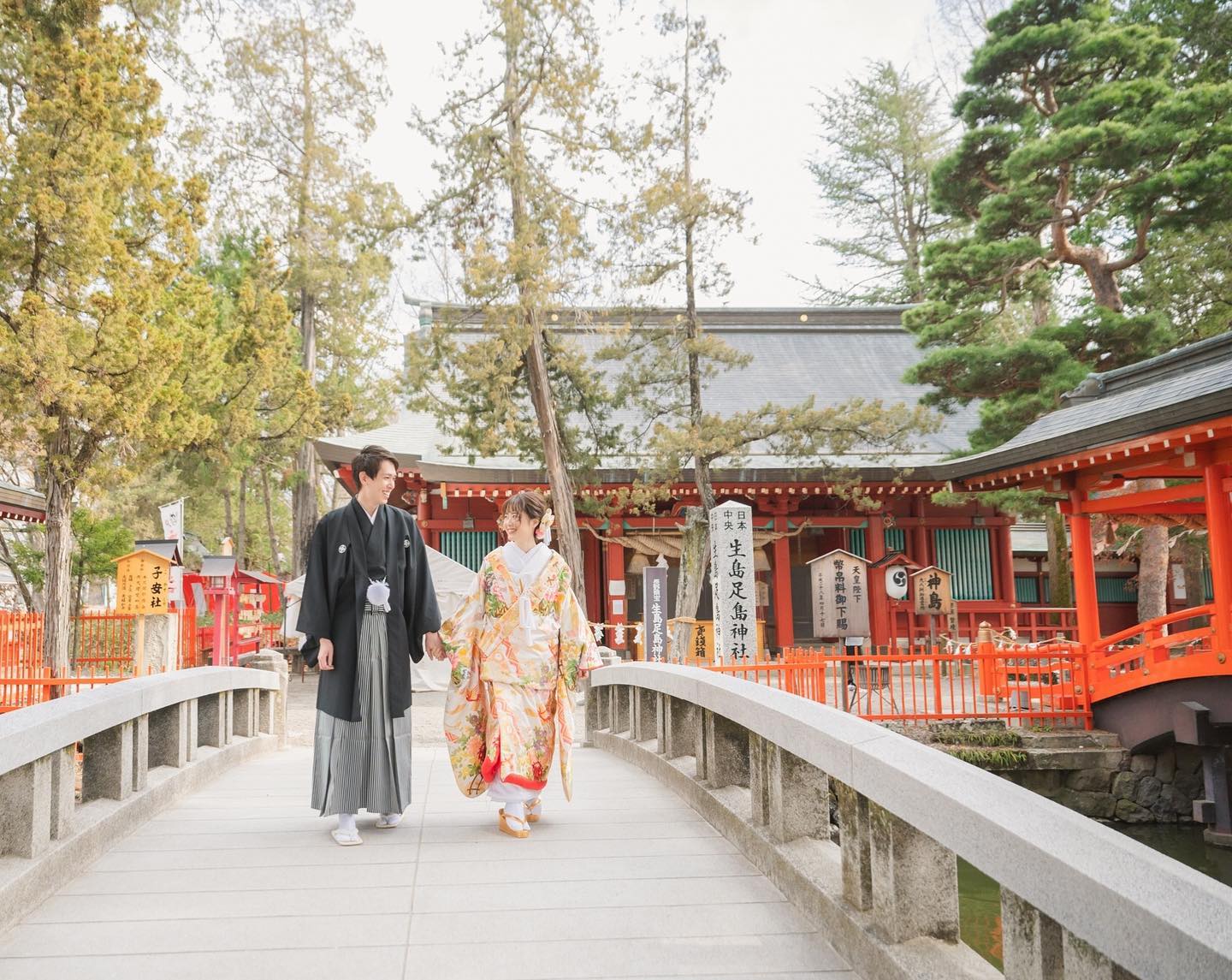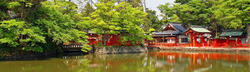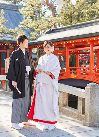 「日本の真ん中に鎮まり、万物を生み育て国中を満ち足らしめ給う日本国土の守護神」とされ今もなお人々に仰がれています。挙式を執り行う御本社は神池に囲まれた神島に鎮座し、古き良き伝統を継承した厳かな神前結婚式が執り行われます。