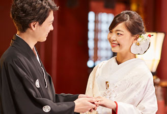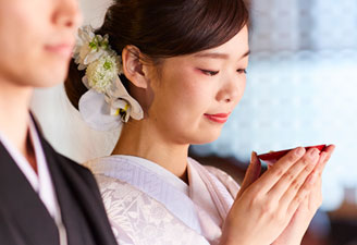 厳かな雰囲気のなか、凛とした空気が漂う「神前式」。執り行われる日本古来の儀式によって二人が繋ぐ新しい家族の絆が生まれます。