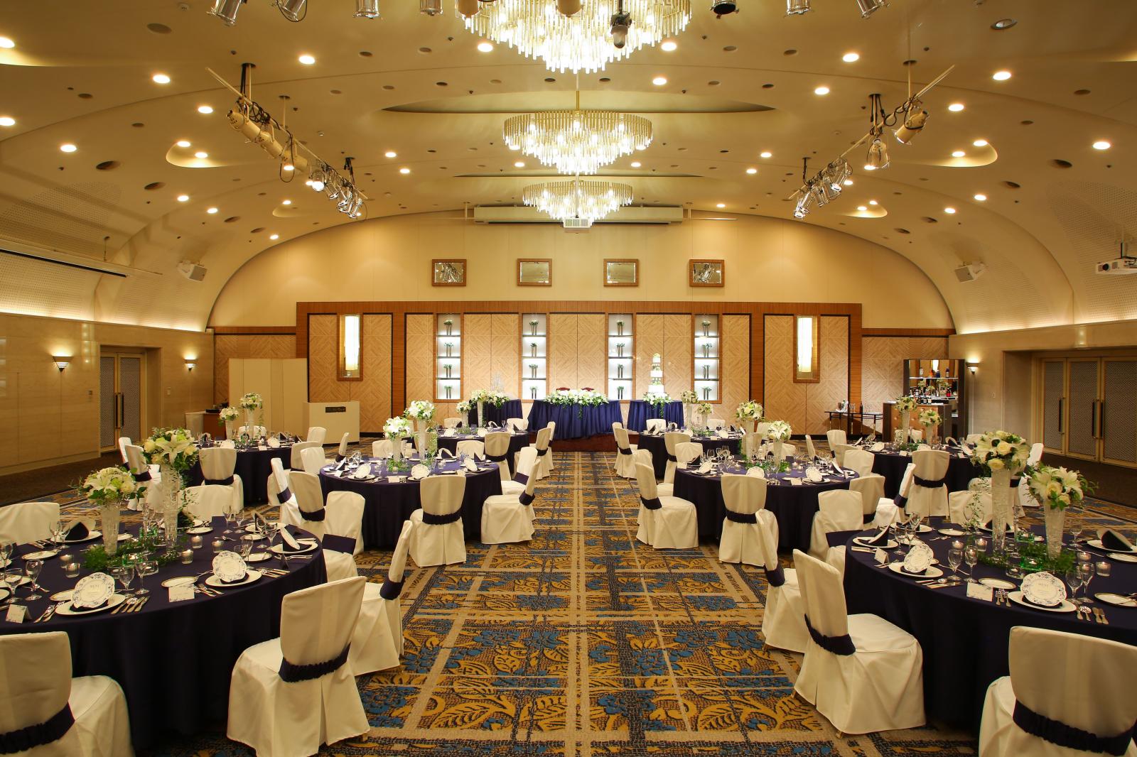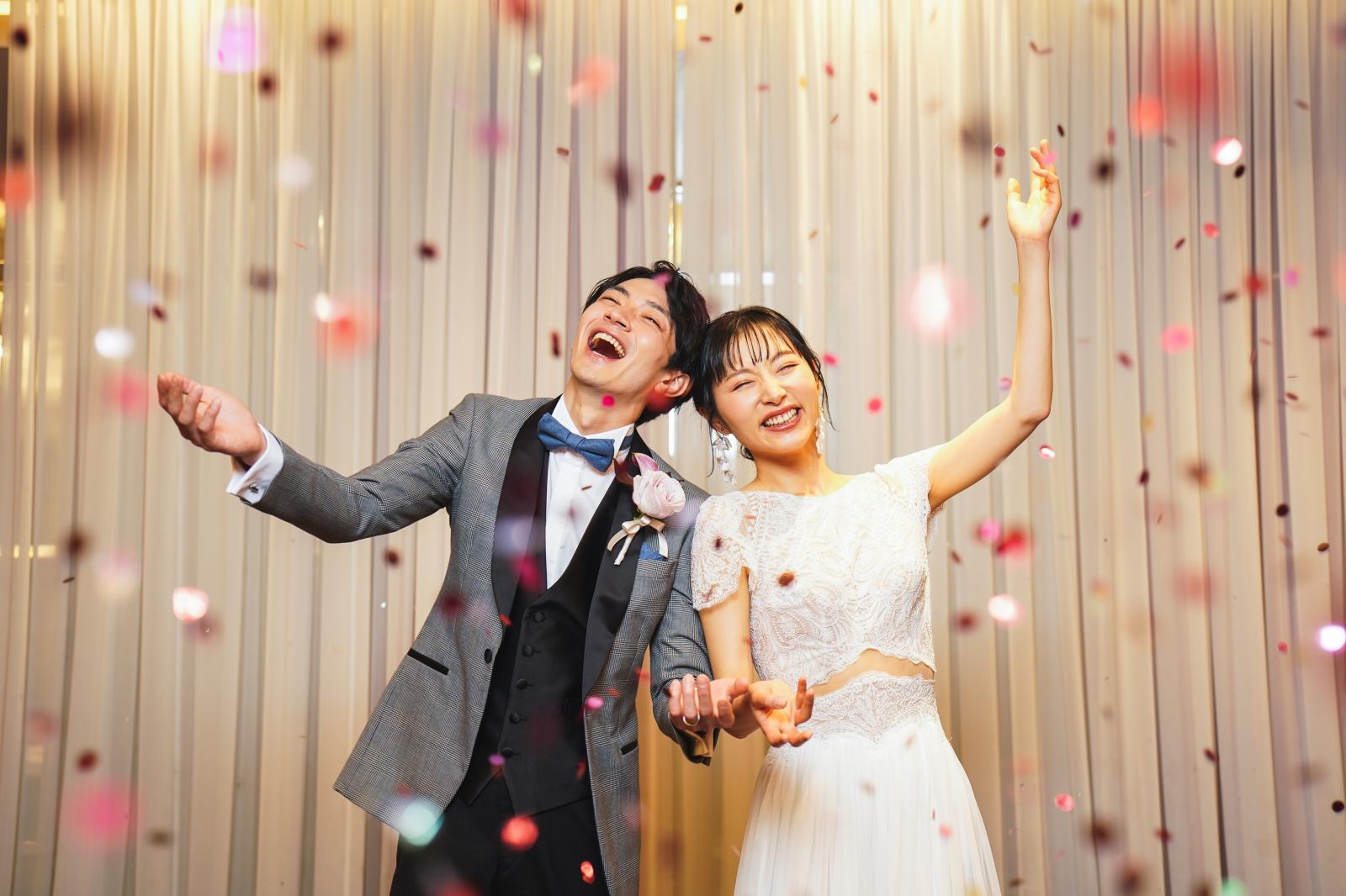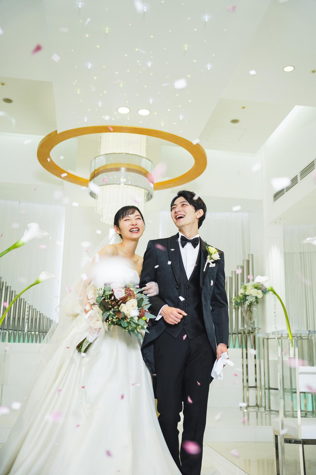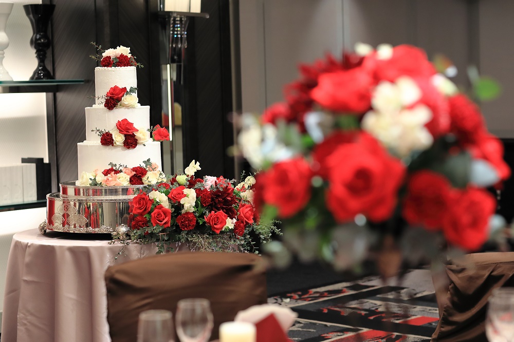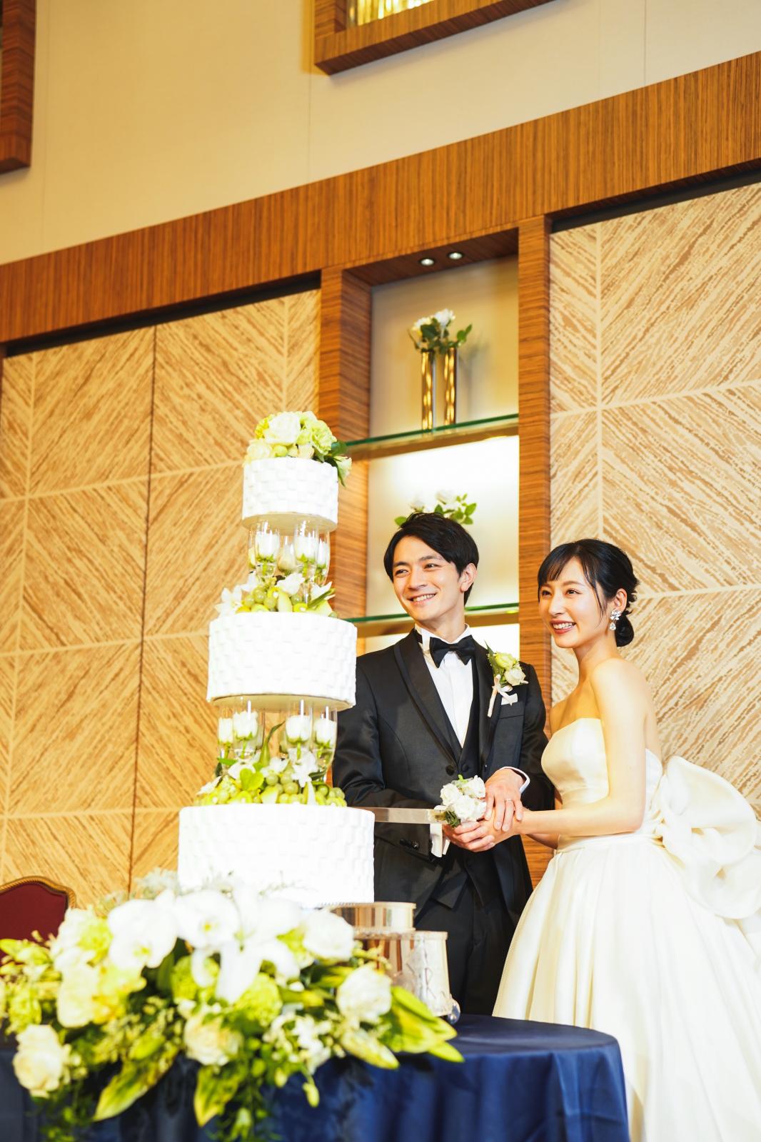 ホテルらしいフランベの演出や高さのある会場だからこそ叶う3段のウエディングケーキ、笑顔あふれるコンフェッティシャワーなどおふたりらしい演出が叶う。