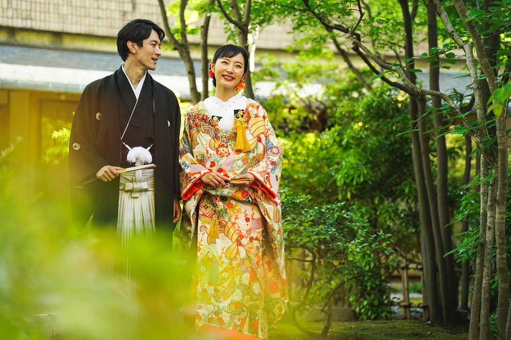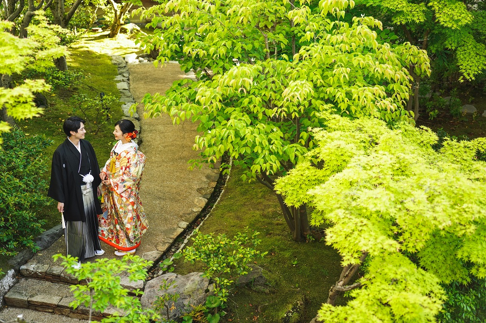 季節によって表情を変える日本庭園。和装も映える人気の前撮りスポット。