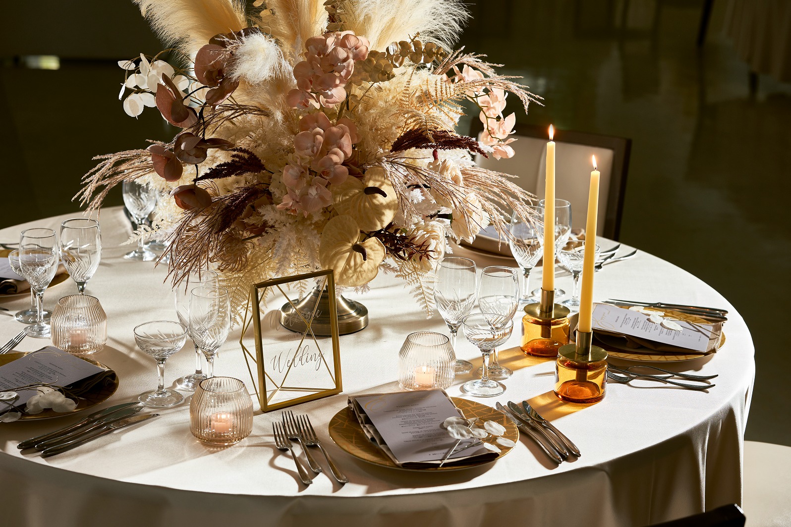 テーブルクロスやナフキン、装花等もお衣裳やお二人のテーマに沿ったコーディネートが可能