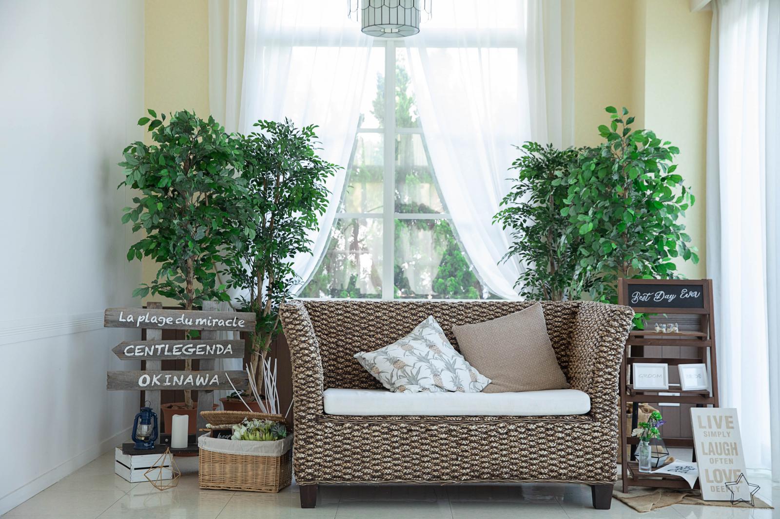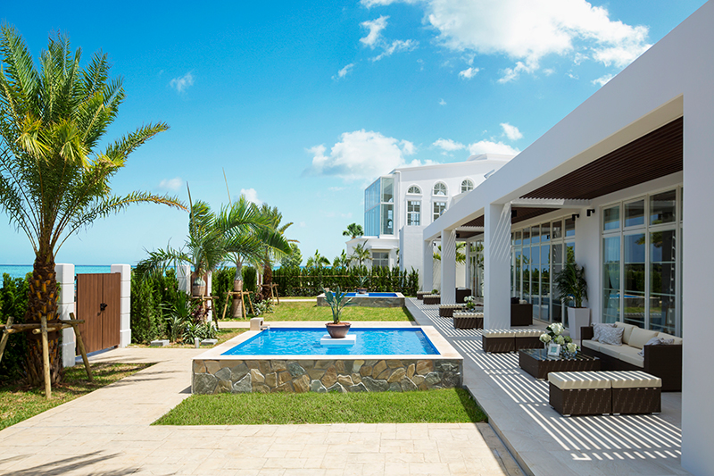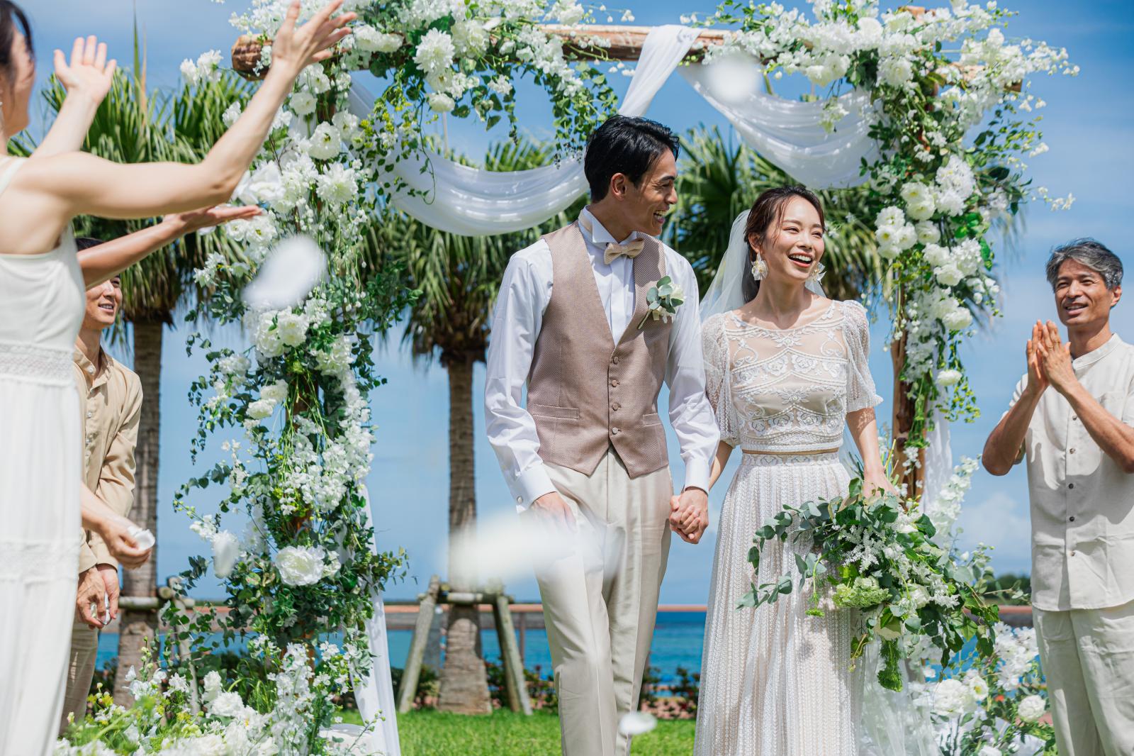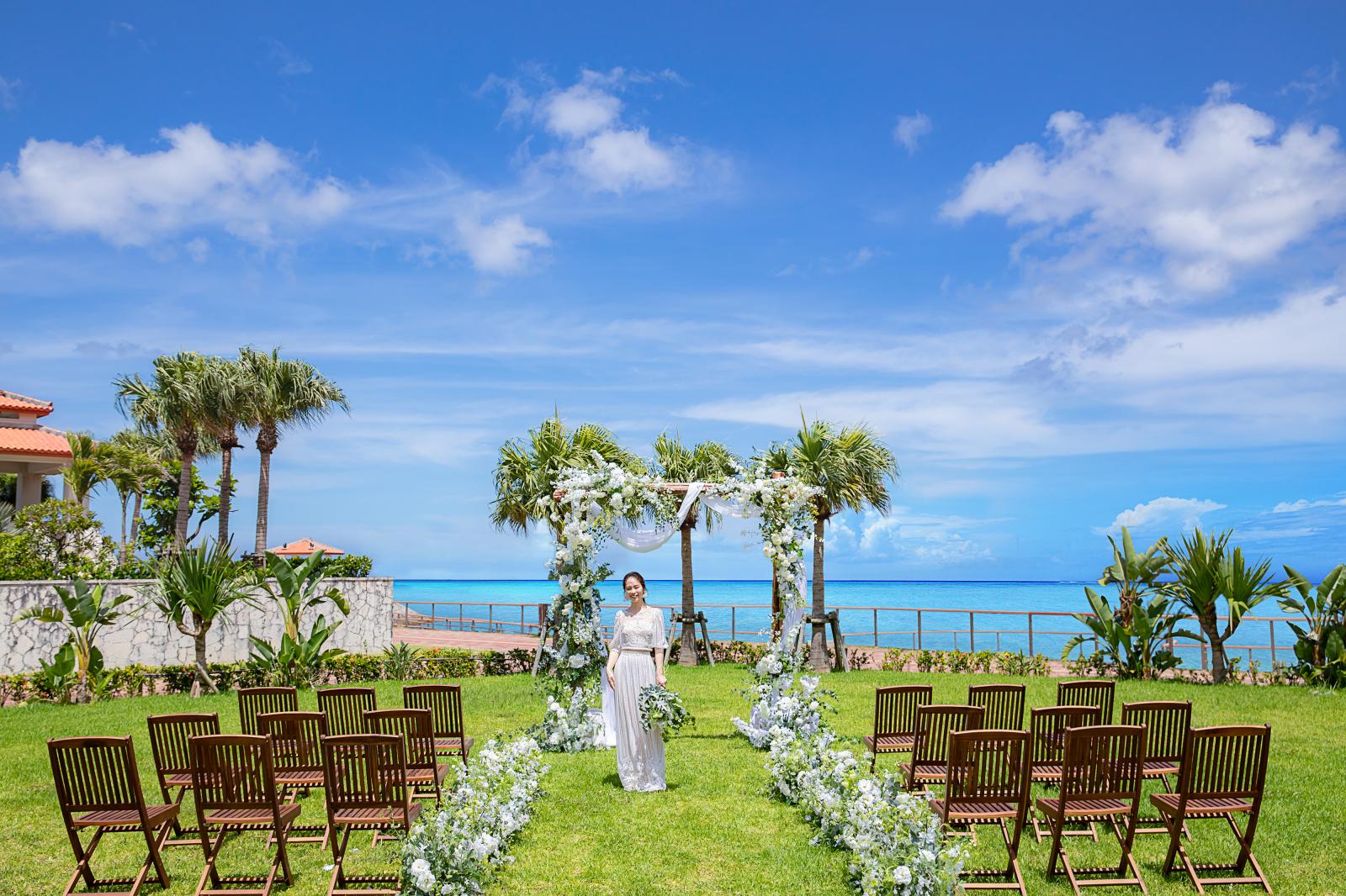 沖縄の真っ青な海と大自然を感じる緑豊かなガーデンウエディング。芝生の緑がまぶしいガーデンは純白のウエディングドレス映えも抜群。