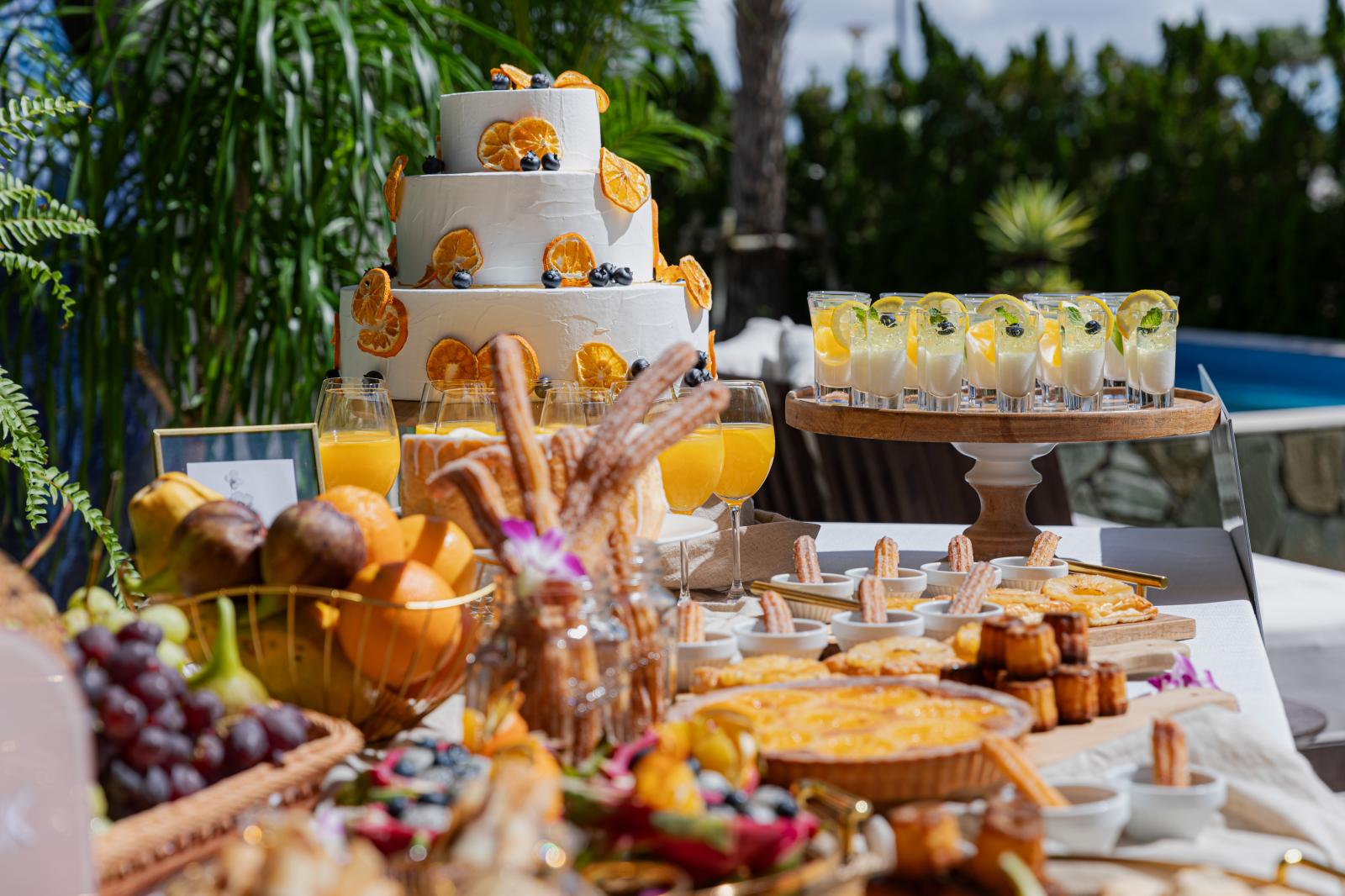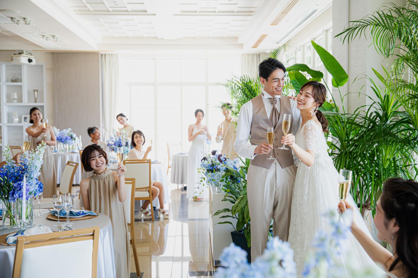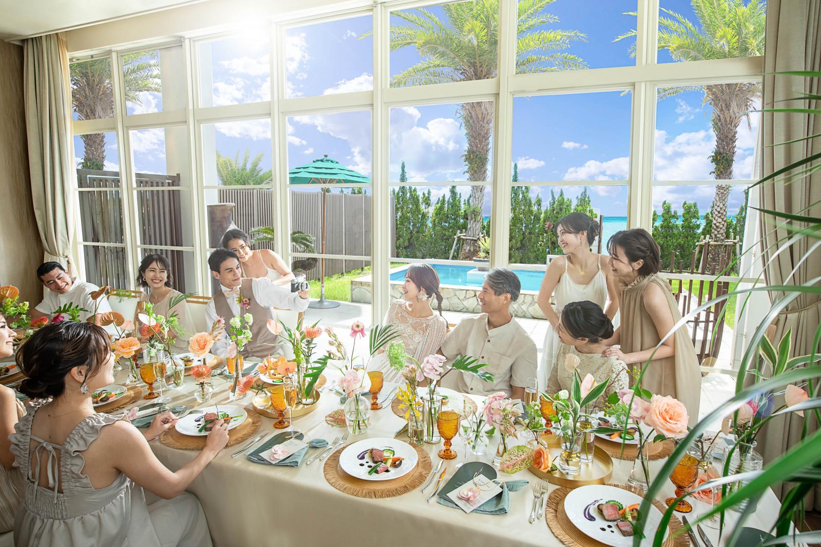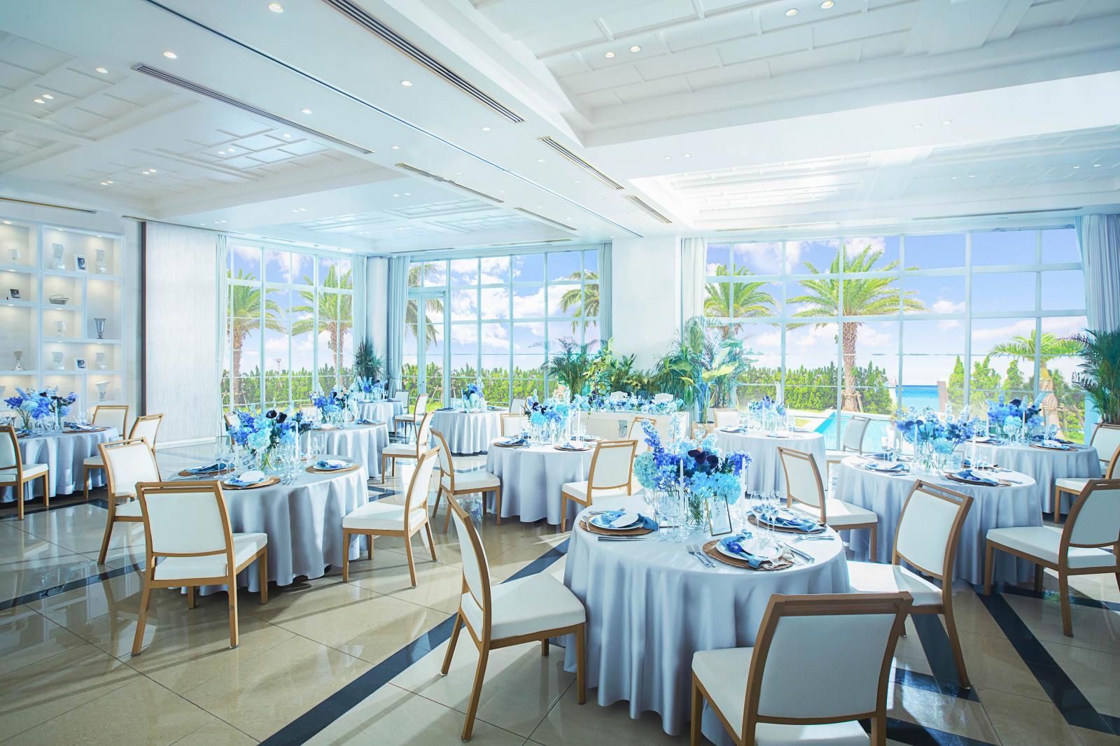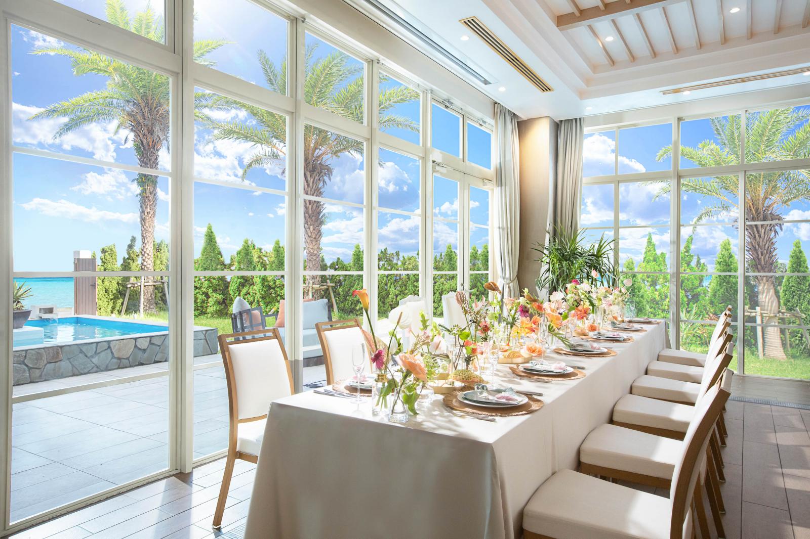 窓から射し込む陽光が明るい雰囲気をつくりあげ、沖縄らしいあたたかく陽気なパーティを演出します。白を基調とすることでどんなコーディネートも映える会場。プール付きテラスもデザートビュッフェやウェルカムパーティなど自由にお使いいただけます!