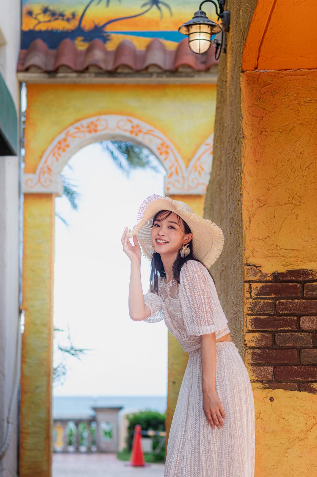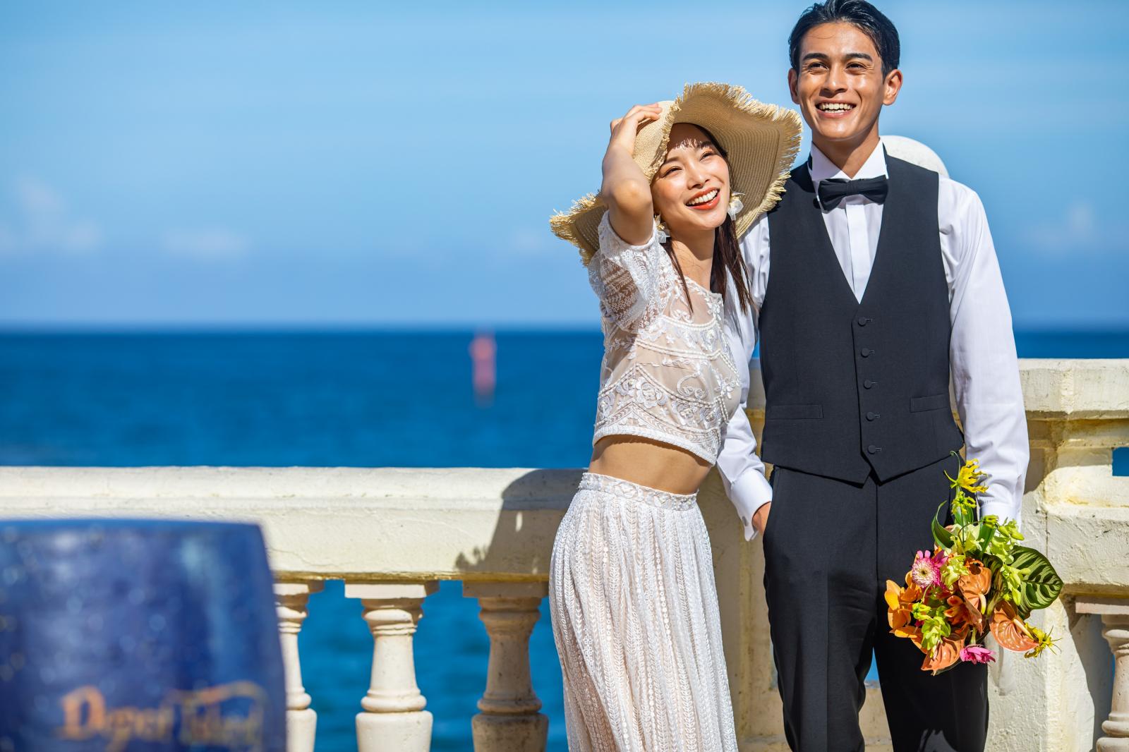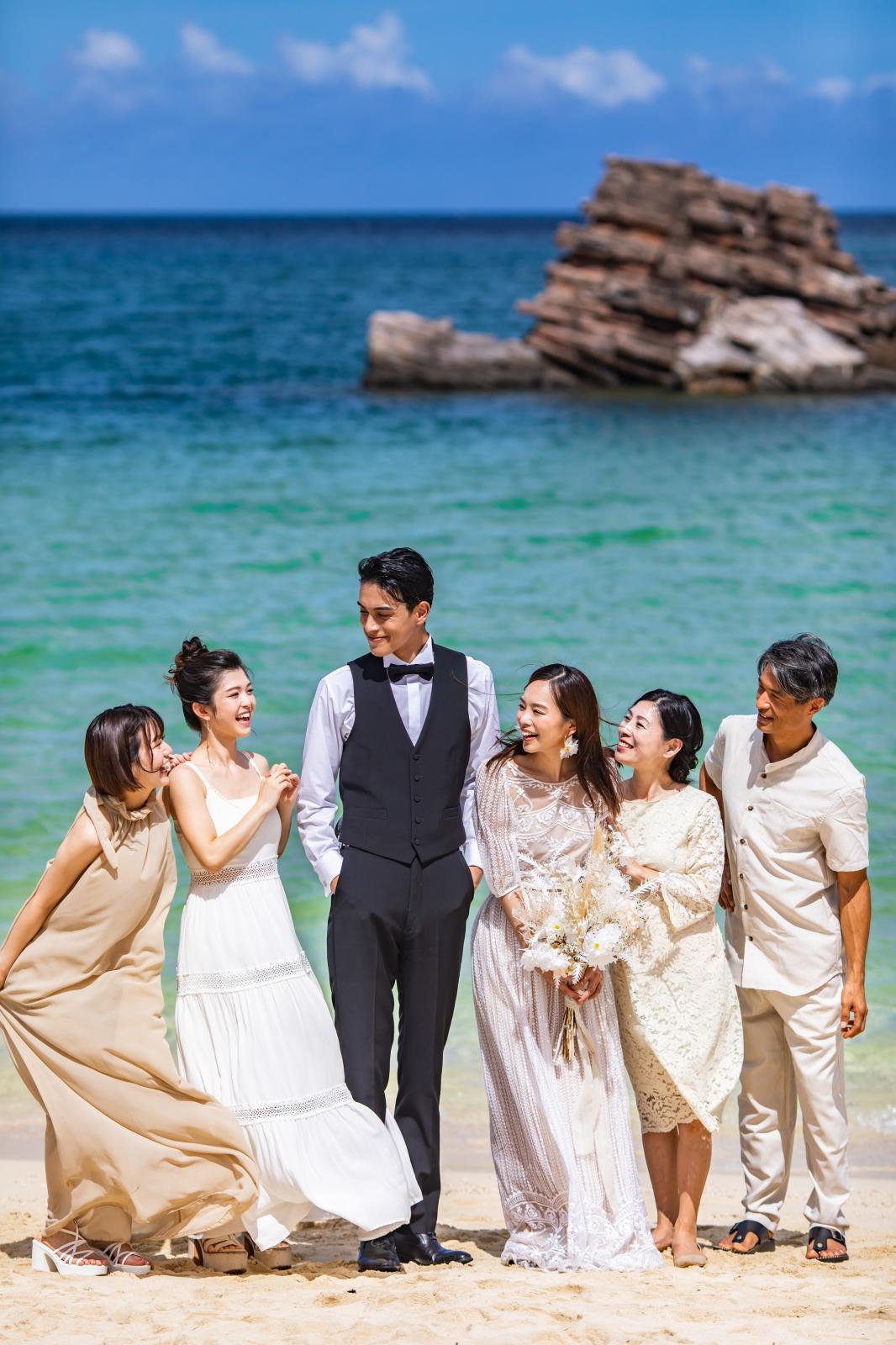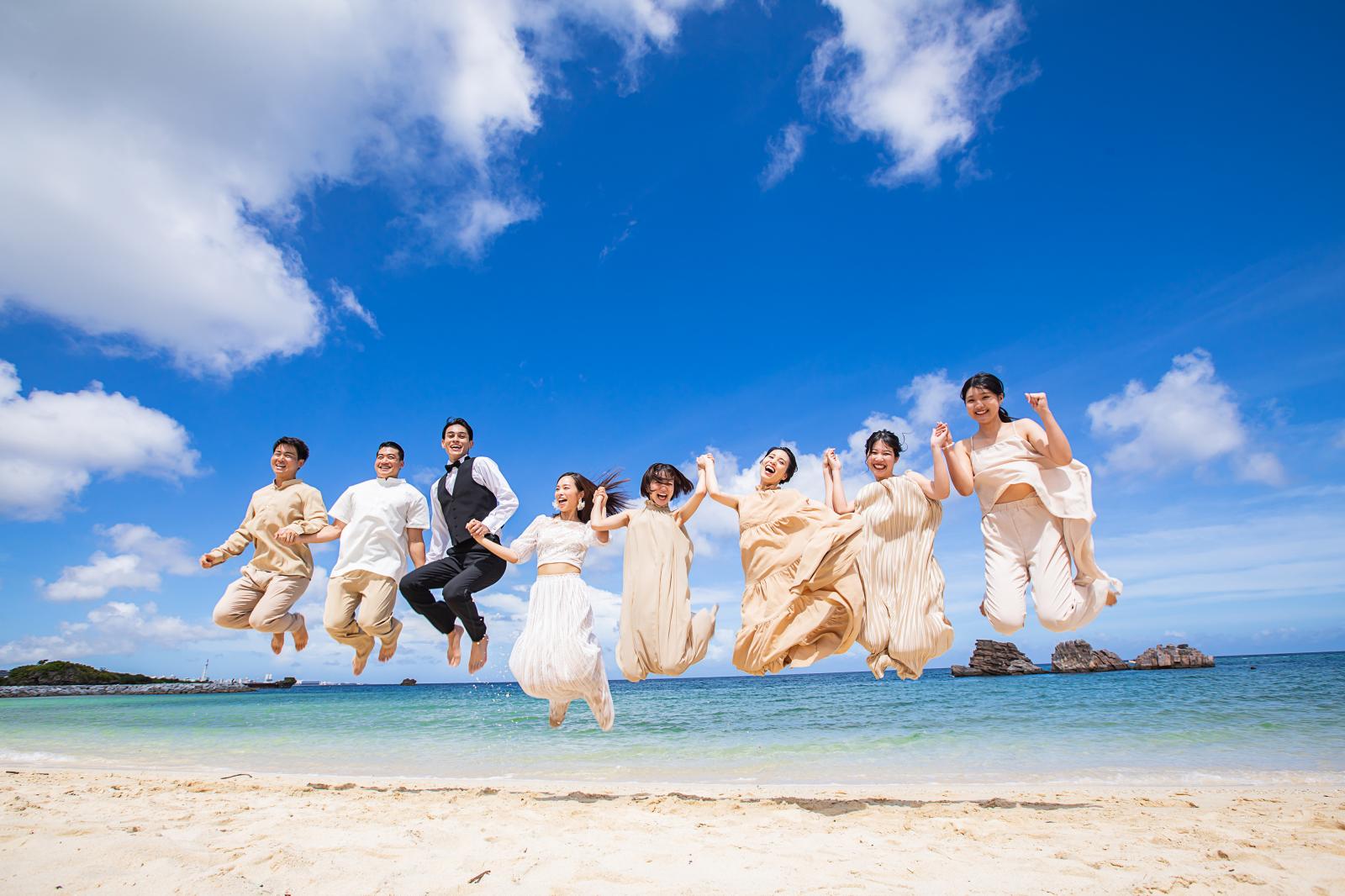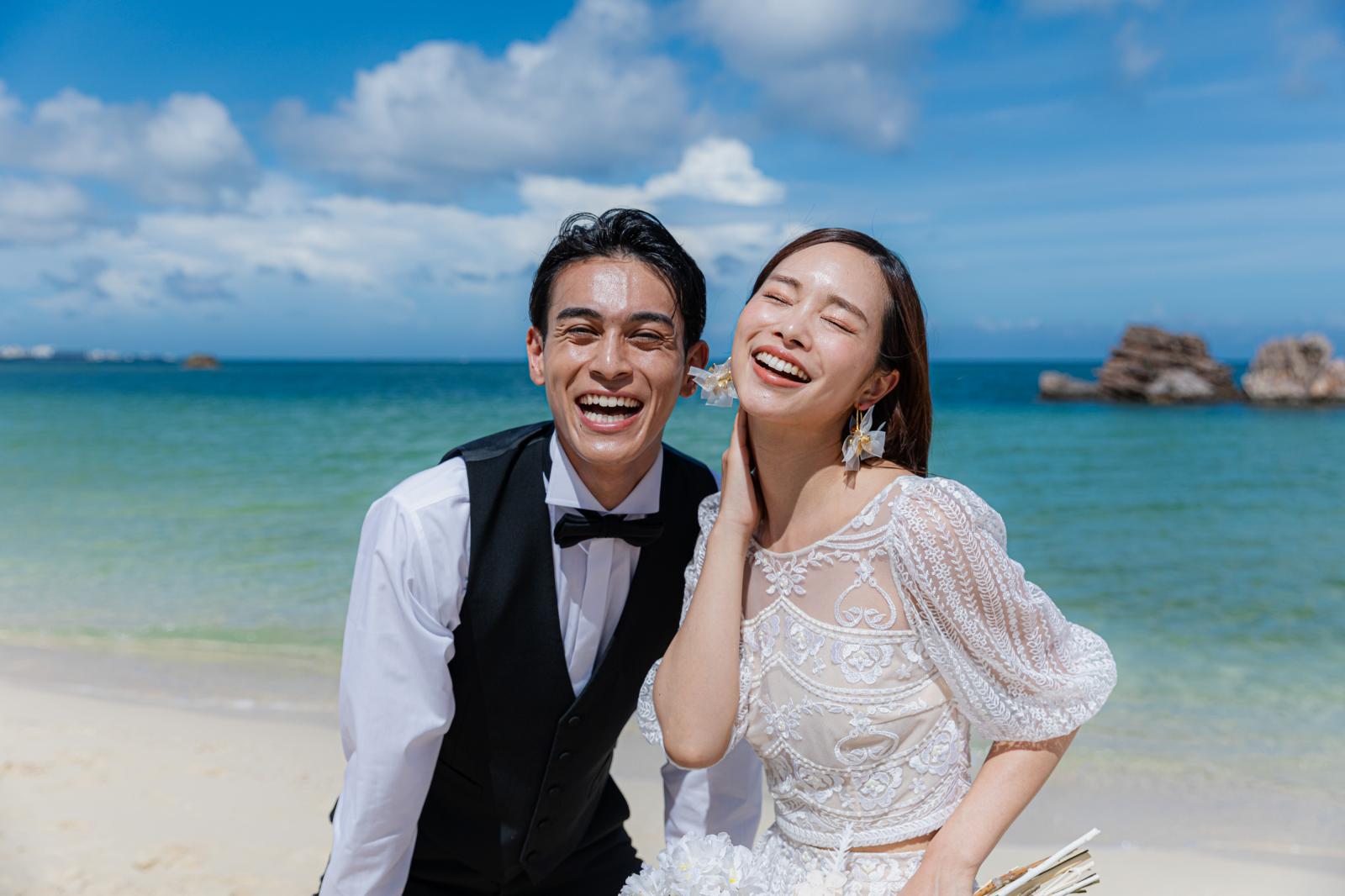 海と空の青色と砂浜の白色の美しいコントラストをバックに、思い出の瞬間を形に残して