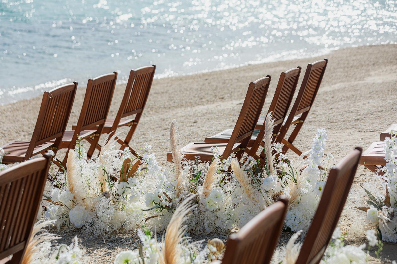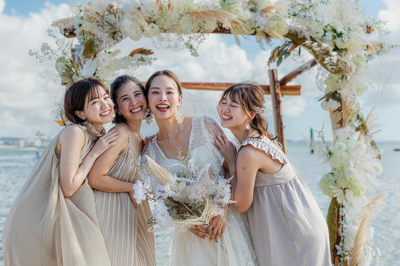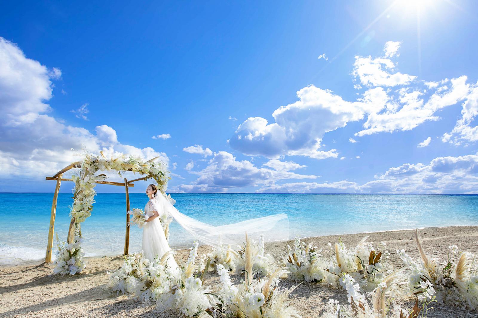 潮が引いている限られた時間にのみ現れる特別なビーチ。会場から徒歩3分と利便性も◎美しい沖縄の眺望はもちろん、砂浜に立つガゼボや風にそよぐチュール等フォトジェニックな写真が残せる。