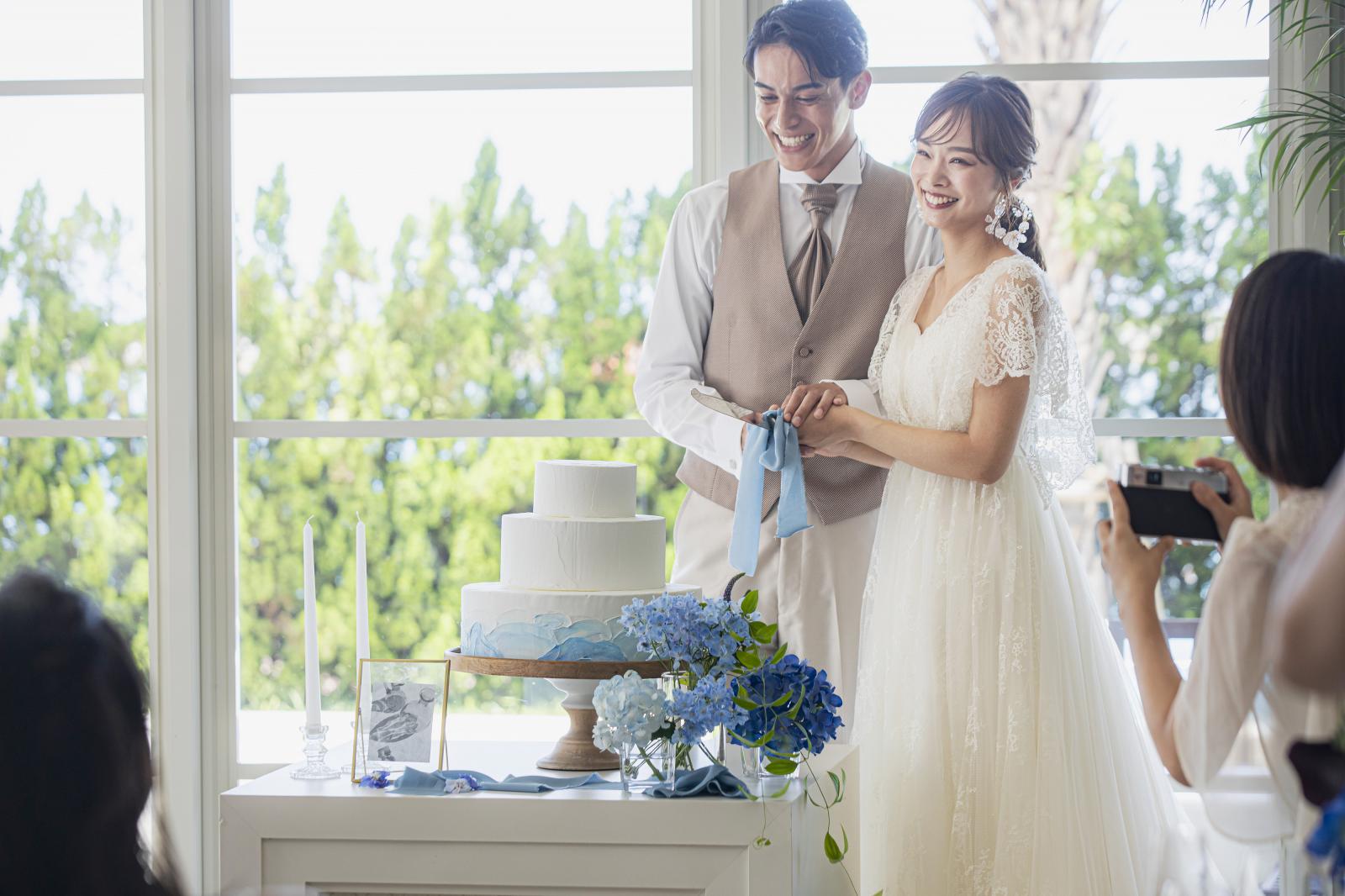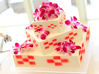 沖縄ならではミンサー柄のケーキやカラードリップケーキなど。ウエディングケーキにもおふたりのアイデアを詰め込んで。