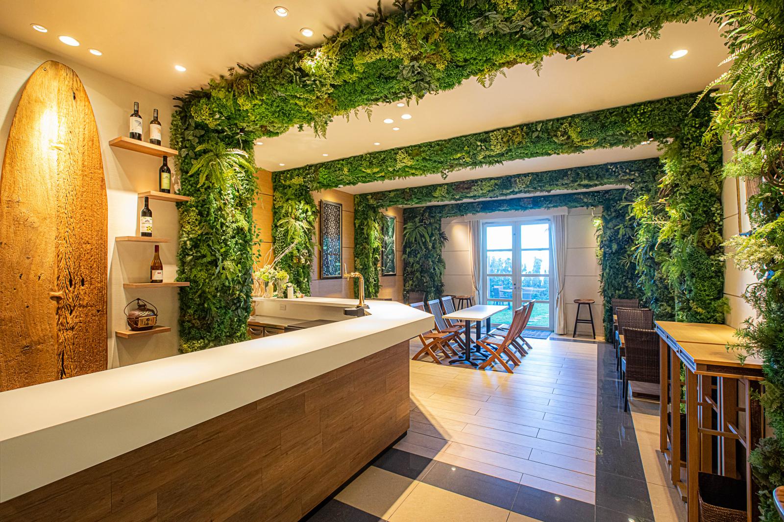 海を望む少人数での プライべートパーティに ふさわしい上質な空間。ゲストと距離間の近いパーティが叶うサイズ感で、大きな窓からは陽光が射し込み、明るく開放的な雰囲気の会場です。併設のプライベートガーデンテラスも自由に使えるのが嬉しい!