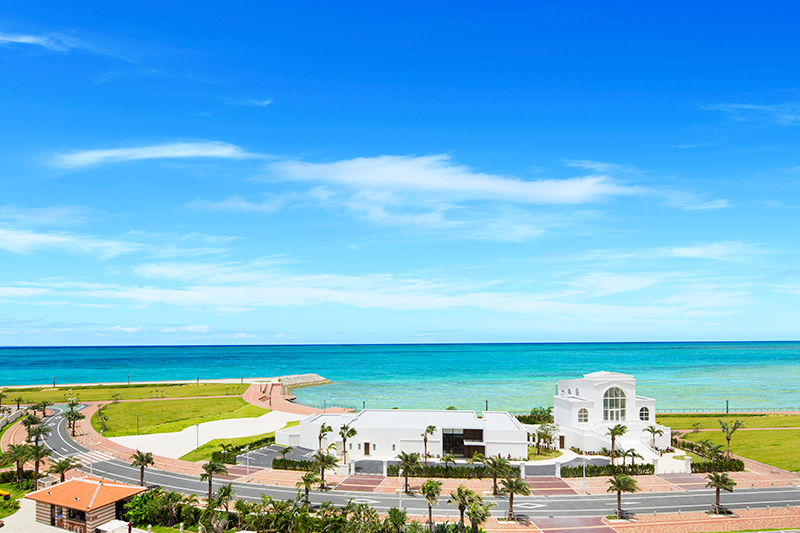 那覇空港から車で35分/世界屈指の美しさを誇る「美ら海」を望む白亜のチャペル。 天井高8m・バージンロード9mのスケールを誇り、水平線まで遮るもののない開放感は圧巻。無限の海と空へ向かって伸びるバージンロードと光にきらめくガラスの祭壇。インフィニティに包まれて憧れのリゾートウエディングを叶えて。