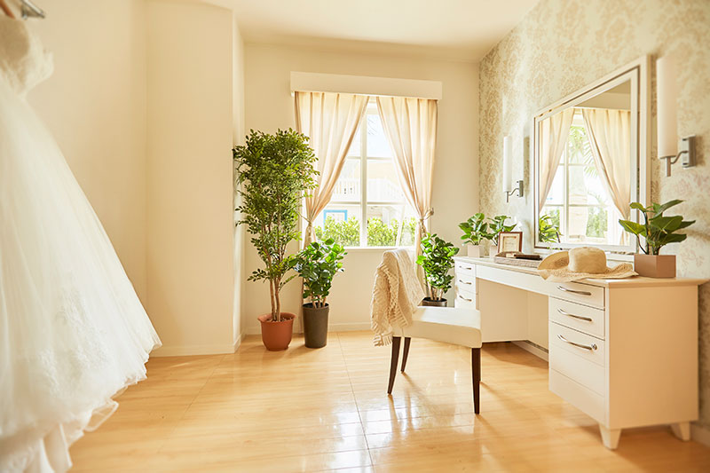 2人専用の控室、ゲスト用の着付け・更衣室、ゲストの待合室としてご利用いただけるバーカウンター付のテラスラウンジ、万が一あいにくのお天気で屋外での撮影が難しい場合でも、しっかりとお写真を残して頂ける写真室など、おふたりとゲストが快適にお過ごしいただけるように設計された充実設備。館内は全てバリアフリーだから安心。