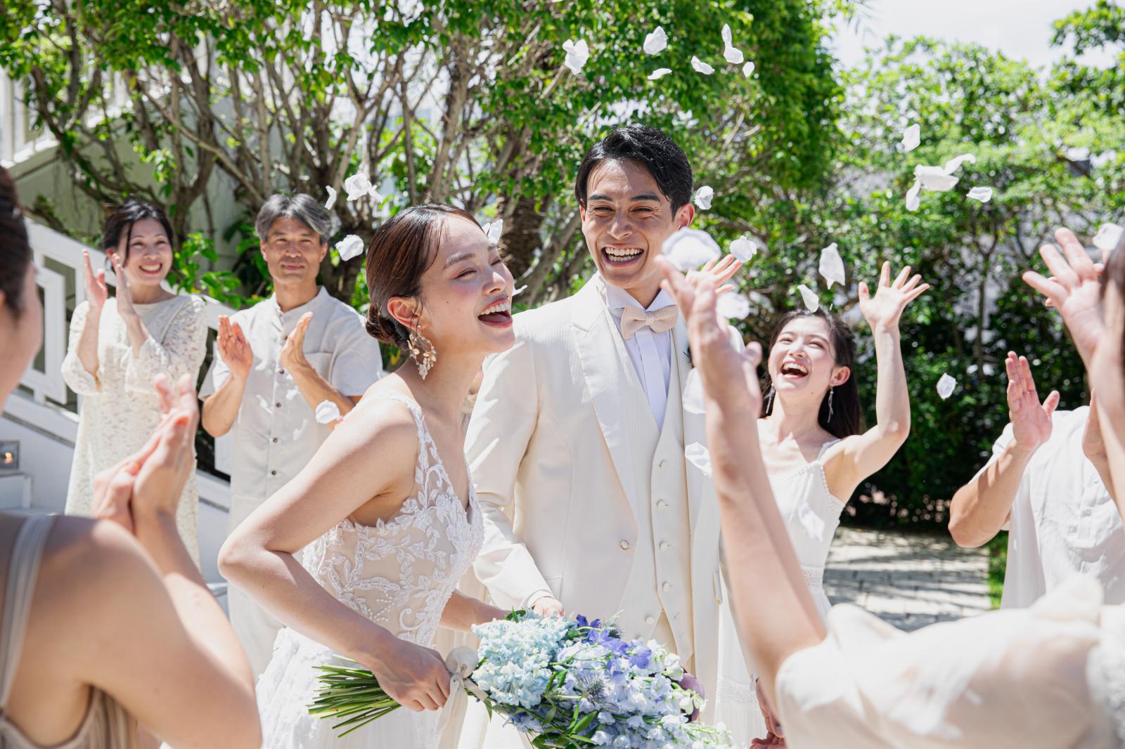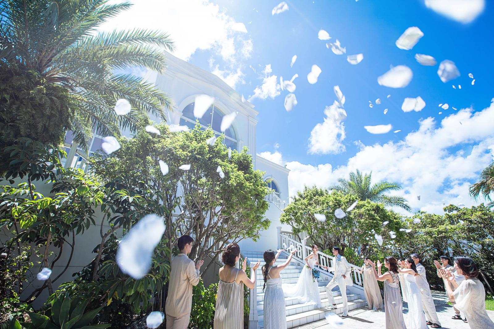 フラワーシャワーやバルーンリリース、沖縄らしくゴーヤトスも。ブーケプルズなどテラス付き大階段だからこそ叶う様々な演出をご提案。