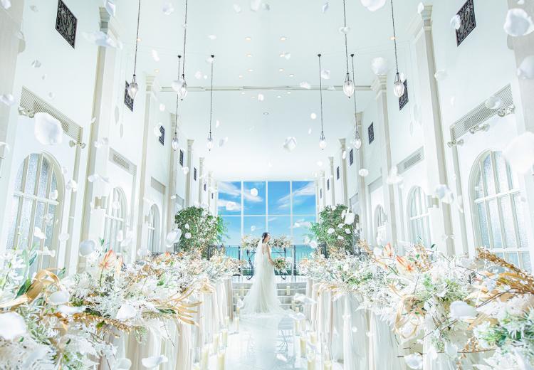 挙式は、海と空の青と白い大理石とのコントラストが美しいチャペルで執り行えます。3階まで吹き抜けになった天井高7mのチャペルは開放感抜群。祭壇正面の大きな窓からは海と空が織りなす美しい景色を見渡すことができ、リゾート感満点。円形の祭壇に立つふたりを眩いばかりの自然光が包み込みます。
