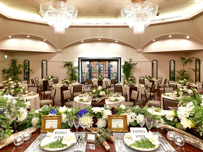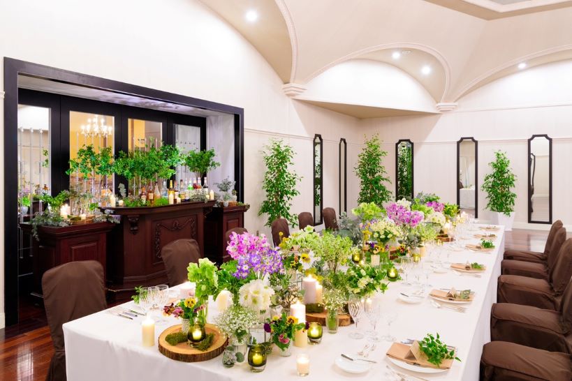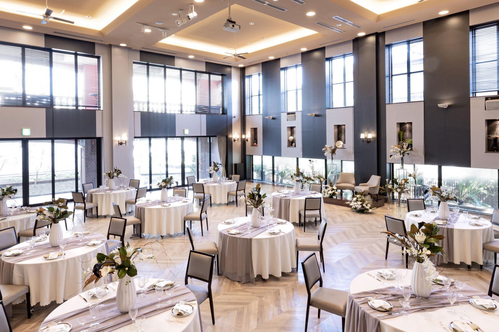 完全独立型邸宅ウェディング・ハウス。風と太陽感じるバンケット。バーカウンター、ゲストルーム、ブライズルーム、ホワイエまでが全て貸切。大切なゲストの皆様へお二人だけのおもてなしを実現します。大きく開かれた窓、のびやかな天井、まるで宮殿での晩餐会のように優雅で気品のある時間を演出いたします。