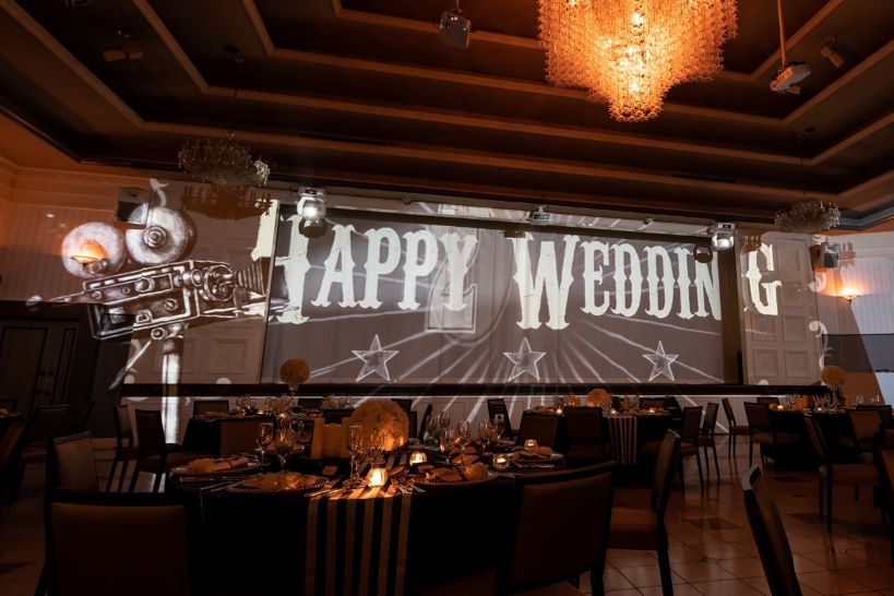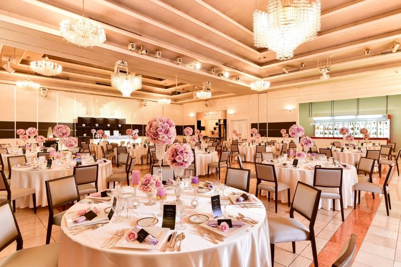 白を基調とし、 凛とした贅沢な空間、光煌めくシャンデリアやアクセントのサイドグレーがモダンな空間を創り上げます。オリジナルカクテルを楽しめるバーカウンターやパティシエ 自らがゲストの目の前で心を込めておもてなしをいたします。ゲストも大盛り上がりの大迫力プロジェクションマッピング☆180°と360°を選べる演出にこだわった会場です。
