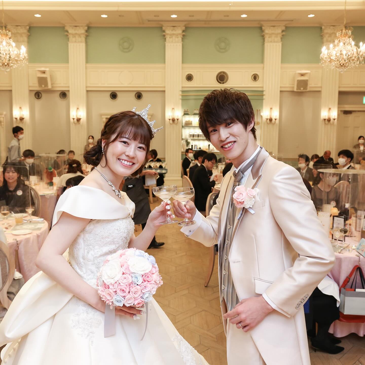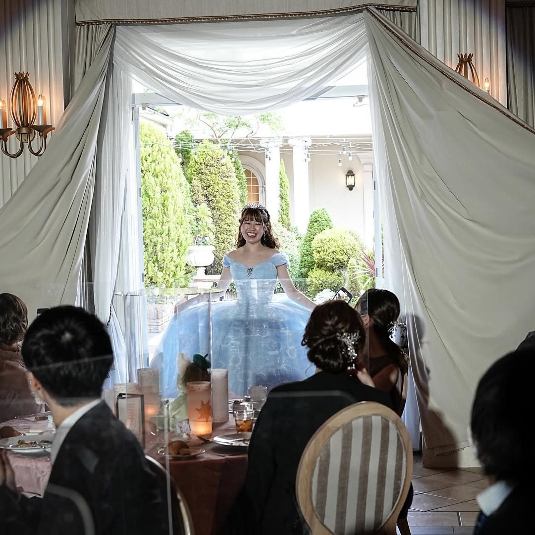🤍披露宴 再入場🤍 お色直しで 夢だったグレーシャスを着て再入場 ということで シンデレラ風に入場👗 まず優太さんが入場して 別の入り口からあんりが入場し ゆうたさんがあんりのところまで 迎えにきて 一礼したあと 2人で一緒に入場しました! だから入場曲は 夢はひそかにを採用♬ 本当は階段を使いたかったけど なかったのが残念。 でも上手にできて よかった🐥✨