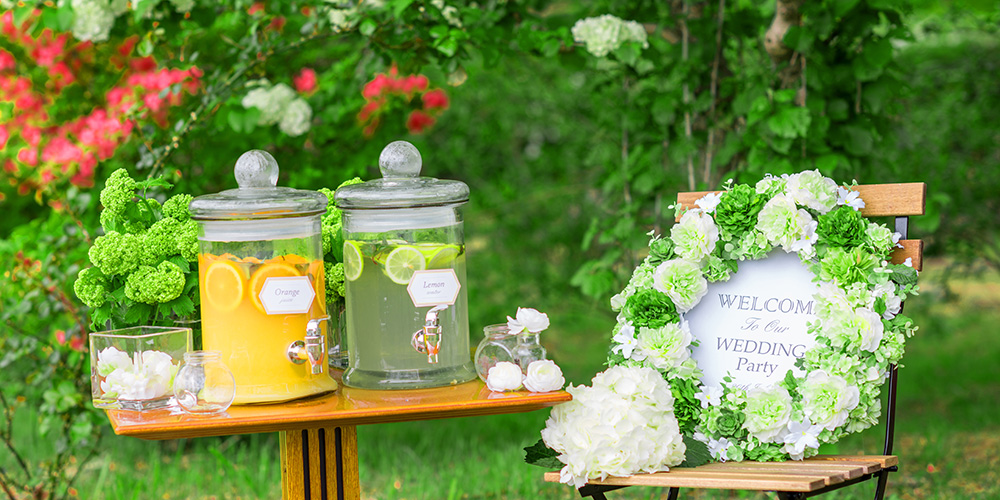 併設のテラスでは ウェルカムパーティーやデザートブッフェなどの演出を爽やかな空気に包まれ 解放感あふれるおもてなしを満喫して