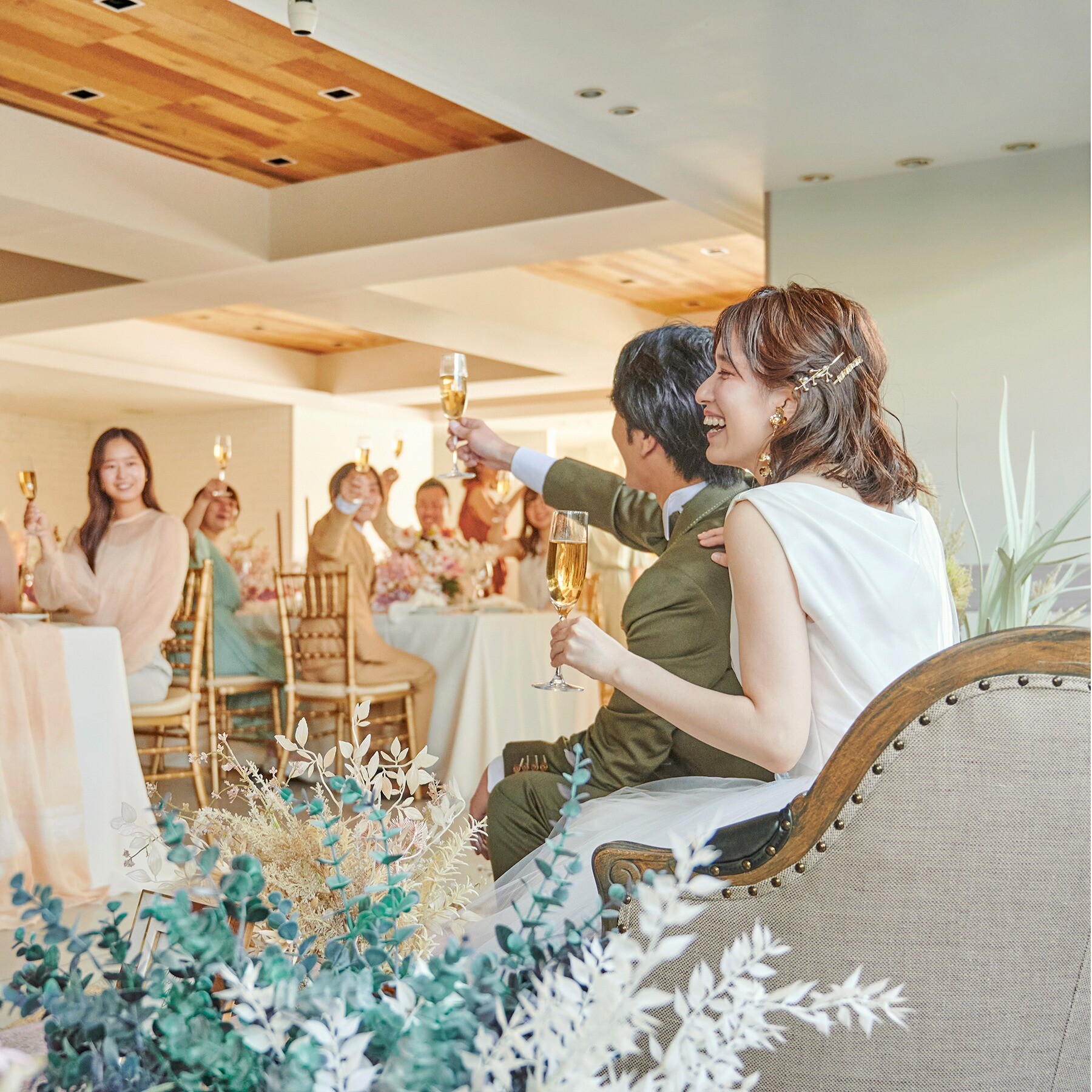 緑に囲まれたテラスが特徴の披露宴会場は窓から自然光が差し込み、あたたかくナチュラルな雰囲気。白を基調とした明るい会場はアレンジ自由なので、ふたりらしさ溢れるパーティーが叶います。トレンド感のある最新コーディネートやふたりの理想を叶えるため、各分野のプロが完全サポート。高砂とゲスト席との距離感もほど良く、笑顔あふれるアットホームな結婚式を心ゆくまで楽しめるでしょう。