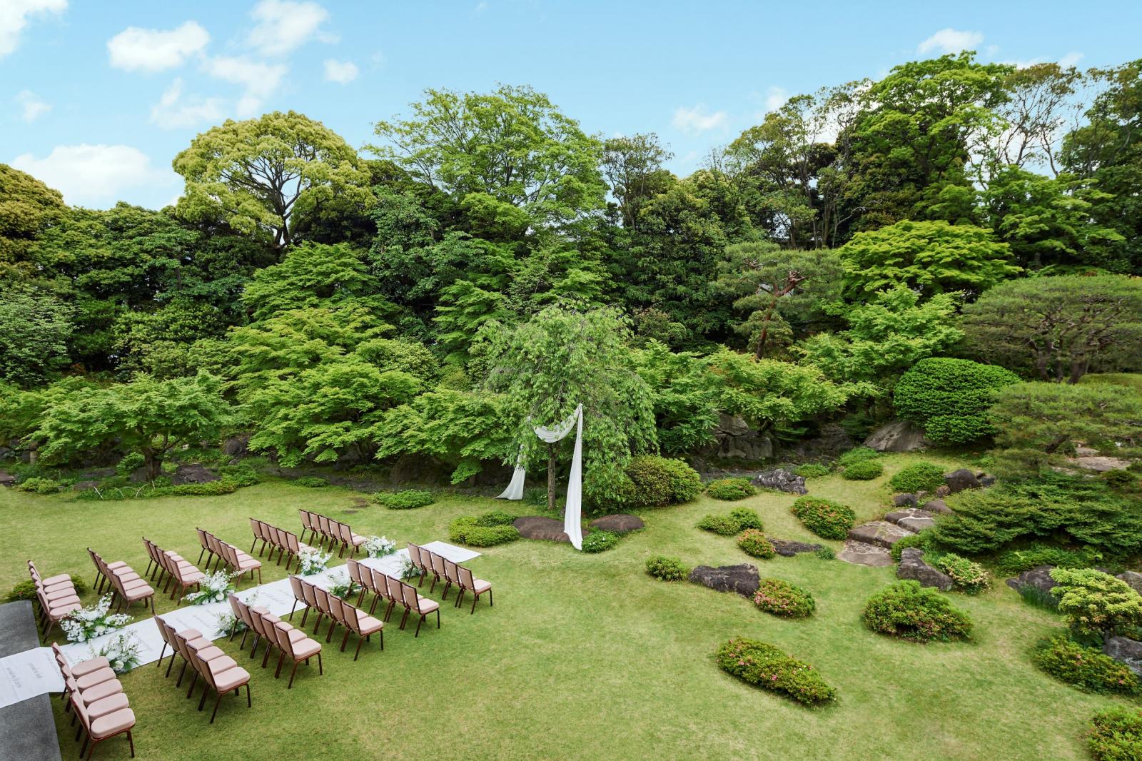 120名着席してもゆとりある大空間でのガーデンウェディングは、お越しいただいたゲストからも歓喜の声が。大自然の中で記憶に残るお時間をお過ごしください。