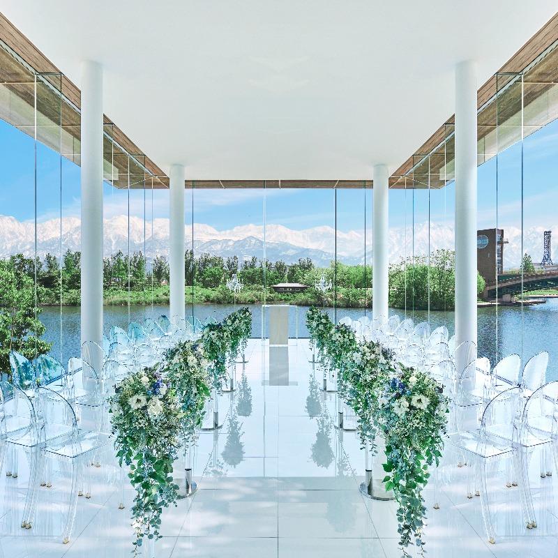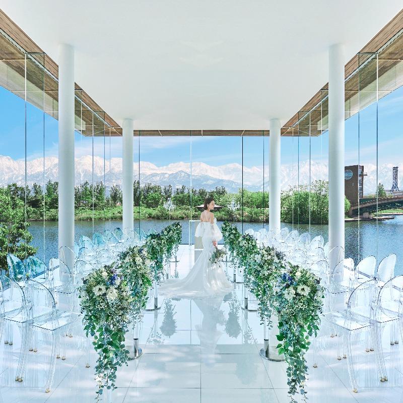 【フェア参加で5,000円ギフト券、さらに1件目来館であればご成約でレストランペアチケット8,000円分プレゼント】動き始めたばかり!何も分からない!そんな方でも自然体で参加できるから安心!環水公園と立山を望むチャペルと会場を実際に見学♪ミシュラン星付きシェフが手がける、富山県産食材を使った贅沢なコース料理を無料でご試食