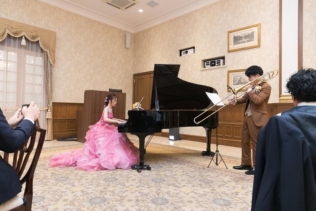 入場したらそのまま高砂に座る…らしいですが…… こういう時期なので…余興も頼むのもなぁ… あ、私たち音楽で知り合ったしなぁ… こういう場でやってみたかったなぁー笑 といろいろ考え、、 結局、自分たちで演奏しましたー! ♪美女と野獣 急遽決まったので練習期間は 3ヶ月!しかも、、家にピアノもない、楽器も吹けない、、、ということで、土日に大学を借りて練習しました…。 いやぁ、大変だったねぇ、、 ピアノは仕事でちらっと弾いてるだけ…ガッツリ弾いてなかったので…… トロンボーンもブランクありすぎて…大学以来… お互い頑張りました〜-⁽ -´꒳`⁾- 当日も午前中練習してからの式でした笑 演奏はどうだったか…ミスったことぐらいしかいまいち覚えてない! でも、楽しかった! ちょっと早くなりすぎたかーなー?とも思うけど、終わりよければすべてよし! 楽しい経験でした♥ この髪型、可愛いでしょ🎀🎀