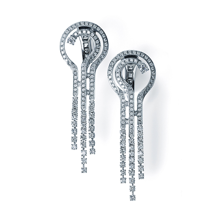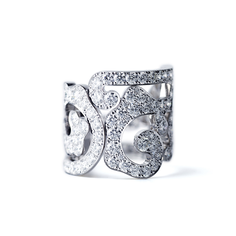 ダイアモンドイヤリングが輝き、手元には「唐花」のリング、そして「叶」と「久遠」の